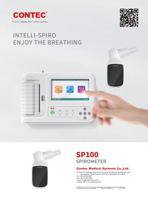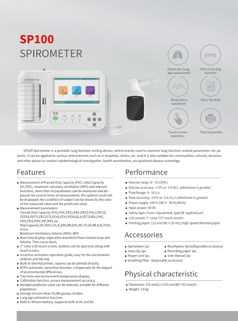 دستگاه اسپیرومتر SP100 یک دستگاه قابل حمل تست عملکرد ریه است که عمدتا برای بررسی پارامترهای مربوط به عملکرد ریه برای بیماران استفاده می شود. می توان آن را در محیط های مختلف مانند بیمارستان ها، کلینیک ها و غیره اعمال کرد و همچنین برای جوامع، مدارس، کارخانه ها و مکان های دیگر برای انجام تحقیقات اپیدمیولوژیک، معاینه بهداشتی، غربالگری بیماری های شغلی مناسب است.