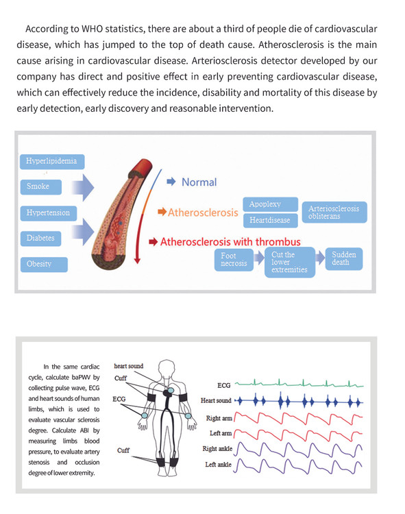 بر اساس آمار سازمان بهداشت جهانی، حدود یک سوم از مردم در اثر بیماری های قلبی عروقی جان خود را از دست می دهند، که به بالاترین علت مرگ و میر رسیده است. آترواسکلروز، علت اصلی بروز بیماری های قلبی عروقی است. آشکارساز تصلب شرایین که توسط شرکت ما ساخته شده است، تأثیر مستقیم و مثبتی در پیشگیری اولیه از بیماری های قلبی عروقی دارد که می تواند با تشخیص زودهنگام، کشف زودهنگام و مداخله منطقی، به طور موثری بروز، ناتوانی و مرگ و میر این بیماری را کاهش دهد.